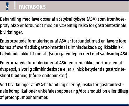 Behandling med lave doser af acetylsalicylsyre (ASA) er effektivt som trombocythæmmende middel ved både primær og sekundær tromboseprofylakse. Ca. 420.000 danskere er i behandling med ASA [1]. Be-handlingen øger risikoen for såvel dyspepsi som
