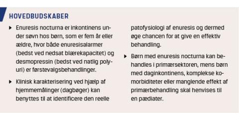 Enuresis nocturna (EN) er inkontinens, som forekommer mindst en gang om måneden under søvn hos børn, som er fem år eller ældre [1]. EN er en hyppig lidelse med klar genetisk indflydelse, og den forekommer hyppigere hos drenge end hos pige, især før 12-årsalderen [2]. Den spontane helbredelsesrate er relativ høj (ca. 15% årligt), dog er den betydeligt lavere hos børn, hvor enuresis forekommer hver nat [2]. Sygdommen har ubehandlet negative følger for barnet i form af nedsat selvværd og livskvalitet.
