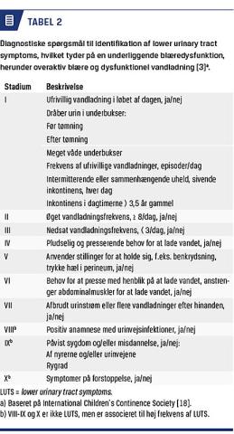 Det første lægebesøg for børn med enuresis er oftest hos en praktiserende læge, når barnet er over fem år gammelt. En grundig anamnese og en kort objektiv undersøgelse inklusive urinstiks, specielt for at udelukke anatomiske årsager til enuresis, er det første trin i diagnosticering. Det er vigtigt at identificere patienter med dagsymptomer, der tit ses hos børn med blæredysfunktion. Man kan med fordel bruge standardiserede spørgsmål (Tabel 2) [3]. Lidelsen hos børn, der har nonmonosymptomatisk EN (NMNE), er typisk mere kompleks, og barnet bør henvises til en specialist. Ved første konsultation bør man også afklare, om der er komorbiditeter såsom obstipation, urinvejsinfektioner og ADHD. Ofte er der behov for, at disse behandles, inden man effektivt kan behandle børnenes enuresis.