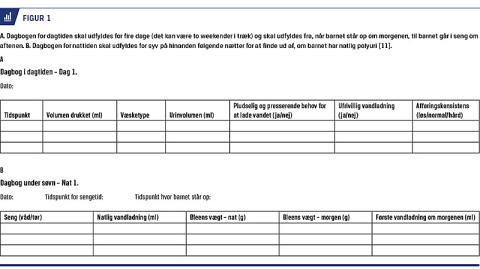 Ud over de ovennævnte anbefalinger består en udvidet tilgang af registreringsskemaer, der kan bruges til at finde den reelle patofysiologi til enuresis og dermed øge chancen for at give den mest effektive behandling. Ved denne udvidede retningslinje udfylder patienten to dagbøger (Figur 1) [11]. Den første dagbog er et skema til registrering af væskeindtagelse og vandladninger i dagtiden, det skal udfyldes over fire dage. Ud fra disse oplysninger kan lægen vurdere barnets blærekapacitet ved hjælp af den største vandladningsvolumen i dagtimerne (undtagen morgenvandladning) og afklare, om der er dagsymptomer. Desuden kan man sikre sig, at der er hensigtsmæssige vaner, hvad angår væskeindtagelse. I den anden dagbog registreres mængden af urin, som er produceret over 7-14 nætter, for at vurdere, om der er natlig polyuri. Urinvolumen kan beregnes ud fra summen af bleernes vægt, morgentømningsvolumen og natlig tømningsvolumen [12].