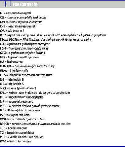 Imatinib er en tyrosinkinase-inhibitor (TK I), der hæmmer signaltransduktion via TK-onkoproteiner Bcr-ABL (t(9;22)), c-KIT og F1P1L1-PDGFRa, TEL-PDGFRb (t(5;12)) og formodentligt andre PDGFRa/b-fusionsgener (Figur 2). Imatinib er førstevalget ved påvist F1P1L1-PDGFRA-fusionsgen [33]. Meget lovende resultater er opnået med lavere doser (100 mg/dag eller mindre) end de, der anvendes ved kronisk myeloid leukæmi [34-36]. Ved højere dosering (400 mg) kan imatinib inducere partiel [37] og komplet remission [34] hos patienter uden fusionstran-skriptet, som udtryk for at der findes endnu ikkeidentificerede imatinib-følsomme TK, der er ansvarlige for eosinofli. Det gør imatinib til et udmærket tredjevalg, da bivirkningerne anses for at være tolerable. Niloti-nib og dasatinib kan som andengenerations-TKI måske anvendes til TK-betingede sygdomme [38].
