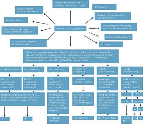 Når ovenstående hyppige årsager til eosinofili er afklaret, koncentreres undersøgelsesprogrammet om reumatisk sygdom, tumorassocieret eller klonal hæmatologisk eosinofili og idiopatisk hypereosinofili på grund af forskellig behandling og prognose.