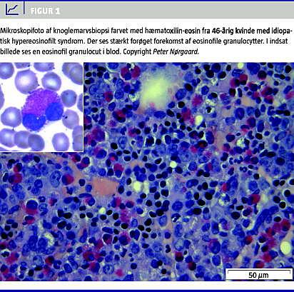 Knoglemarven er hypercellulær og domineret af modne eosinofile granulocytter (Figur 1 og 2). Hyp-pigst ses opmodning af såvel granulopoiesen som erytro- og megakaryopoieserne. Venstreforskydning af granulopoiesen med et forøget antal myeloblaster (5-19%) eventuelt med dysplastiske forandringer -giver mistanke om neoplastisk sygdom [7]. Ved akut leukæmi ledsaget af hypereosinofili ses definitorisk mere end 20% blaster i blod og/eller knoglemarv [25]. Hypereosinofili i knoglemarven kan ledsages af knoglemarvsfibrose [26]. Mastceller påvises ved specialfarvning og mastcelleaktivitet ved måling af øget serumtryptase (Figur 2).