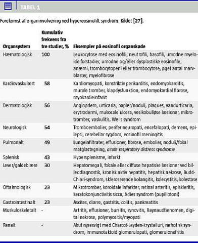 Vedvarende eosinofili kan medføre vævsskade, men den er ikke obligat, og sværhedsgraden varierer [7]. Det er derfor vigtigt at udføre funktionsundersøgelser på diagnosetidspunkt og til monitorering hos den enkelte patient [13]. Hjerterelateret dødsfald er den hyppigste dødsårsag [7], men også nervesystemet, lungerne, huden, mave-tarm-kanalen, det hæmatopoietiske system og nyrer kan være påvirkede af eosinofili og eosinofil infiltration. Den kumulative frekvens af eosinofil organskade hos 105 patienter med eosinofili fremgår af Tabel 1 [27]. Patienterne kan tænkes at repræsentere en heterogen gruppe, som med molekylærbiologisk teknik i dag kunne subklassificeres. Aktuelt må sådanne retrospektive opgørelser anvendes som udtryk for risiko for organpåvirkning ved primær og idiopatisk eosinofili generelt.