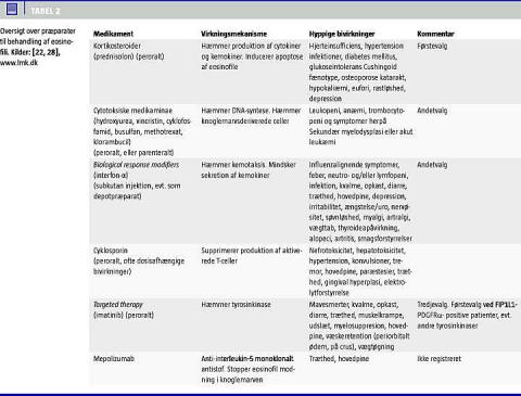 Ved klonal blodsygdom eller iHES kan cyklosporin anvendes sammen med prednisolon som et ste-roidbesparende medikament. En lille serie har vist klinisk og hæmatologisk bedring ved denne kombination, men bivirkningerne er udtalte, og behandlingen kræver overvågning af serumkoncentration [29] (Tabel 2). Cytostatisk behandling med hydroxyurea, som det mest anvendte og veltolererede var indtil for nyligt andetvalg hos steroidresistente patienter. Brug af anden kemoterapi bør forbeholdes de få patienter, som har leukæmi eller lymfom, og hvor andre midler ikke kan begrundes på molekylærbiologisk status [7] (Tabel 2). Resultaterne fra flere studier har vist, at -interferon-α (IFN-α) har effekt ved iHES og kan medføre klinisk bedring og reduktion af eosinofili [30, 31]. Bivirkningerne ved behandling er hyppige, især hos ældre, og stoffet frarådes til behandling af T-cellemedieret HES [32]. IFN-α kan anbefales som andetvalg ved steroidrefraktære patienter under 60 år og kan anvendes under graviditet.