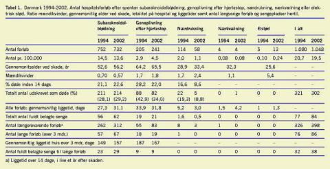 Resultater: Efter direkte aldersstandardisering til European Standard Population fandtes incidensen af forløb efter spontan SAH at være let faldende til 12,3 pr. 100.000 af befolkningen i 2002. Gennemsnitsalderen steg med 3,6 år til 56,2 år. Specielt bemærkedes en udtalt forskydning mod højere debutalder hos mænd. Hospitalsletaliteten steg let til 29,2% i 2002. Efter hjertestop med vellykket genoplivning steg det aldersstandardiserede antal forløb fra 3,37 i 1994 til 4,49 pr. 100.000 i 2002. Hospitalsletaliteten faldt i samme tidsrum fra 43% til 34% under samtidig stigning i antal længerevarende forløb. Sengeforbruget til forløb ud over tre måneder efter SAH og hjertestop var tilsammen omkring halvdelen af forbruget til patienter med traumatisk hjerneskade. Andre årsager til mindre hyppige nontraumatiske hjerneskader må også tages i betragtning.