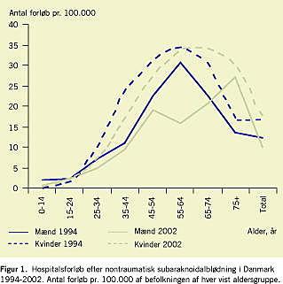 Antallet af LPR-registrerede forløb efter spontan SAH steg ifølge Sundhedsstyrelsens redegørelse [1] fra omkring 500 i 1978 til 800 i 1993, ifølge aktuelle arbejde var der en let faldende tendens i det efterfølgende tiår. Formentlig på grund af den stigende gennemsnitsalder ved debut var antallet af længerevarende og langvarige forløb dog stigende. SAH-diagnoser fra Landspatientregisteret er tidligere [4, 5] blevet verificeret ved journalgennemgang i 36-93% af tilfældene, afhængigt af specialiseringsgraden på den udskrivende afdeling. De aldersstandardiserede incidenser i aktuelle arbejde svarer for aldersintervaller 45-74 år nøje til den danske del af undersøgelser af incidenser i vestlige lande [3, 6]. I en populationsbaseret undersøgelse fra Sydsverige i 1996 [7], aldersstandardiseret til den svenske befolkning, fandtes en incidens på ti pr. 100.000 af befolkningen, inklusive døde, som ikke havde været på hospital. Totaltallene fra LPR's udskrivningsstatistik kan ikke tages helt for pålydende som udtryk for incidensen af SAH, dels grundet en ukendt procentdel af diagnosefejl, og dels modsatrettet, fordi kun hospitaliserede patienter er medregnet. Uanset dette har det interesse at notere den kraftige højreforskydning af maksimum af den aldersspecifikke incidens, især for mændenes vedkommende, hvilket allerede kunne ses i tallene fra 1979-1993 [1], men blev meget tydeligt i 1994-2002. Denne »udsættelse« af debut af SAH kan skyldes ændring af risikofaktormønsteret. I en metaanalyse fra 1996 [8] konkluderede man, at de betydeligste risikofaktorer var rygning, hypertension og stort alkoholforbrug, alle modificerbare. Specielt de seneste års nedgang i tobaksrygning er veldokumenteret både i Danmark og i andre lande [9], ligesom det systoliske blodtryk ifølge en befolkningsundersøgelse i København fandtes at være faldende i perioden fra 1976-1978 til 1991-1994 [10].