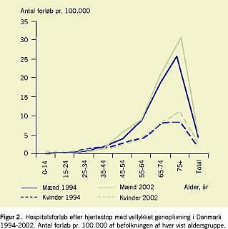 Figur 1 viser for 1994 et maksimum i incidensen pr. 100.000 i aldersgruppen 55-64 år for begge køn. I 2002 var der sket en højreforskydning, særlig tydelig for mænd, hvor det nye maksimum lå hos de 75+-årige. Trods den markant stigende gennemsnitsalder ved debut var letaliteten på hospital procentvis kun let stigende fra 1994 til 2002. Den stigende alder kan dog være årsag til, at de gennemsnitlige liggetider og antallet af længerevarende og lange forløb viste stigende tendens, selv om det totale antal forløb var næsten uændret. 13% af de patienter, der blev udskrevet i live, havde liggetider på over tre måneder.