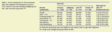 Resultater: Af 109 inkluderede børn havde 81% pludselig symptomopståen og 46% postinfektiøs ITP. Ved diagnosen havde 62% TBC < 10 × 10 9 /l, 41% havde frisk slimhindeblødning, og 72% fik medicinsk behandling. Enoghalvfems børn blev fulgt i seks måneder. Syvogtres børn med akut ITP havde TBC < 150 × 10 9 /l i 11 dage (median). Fireogtyve børn fik kronisk ITP, otte af dem havde vedvarende TBC < 20 × 10 9 /l. Snigende symptomopståen havde en prædiktiv værdi på 64% for kronisk ITP. Af i alt 57 registrerede ITP-relaterede hændelser fandt 45 sted hos børn med kronisk ITP; 23 var fordelt på seks børn med vedvarende TBC < 20 × 10 9 /l.