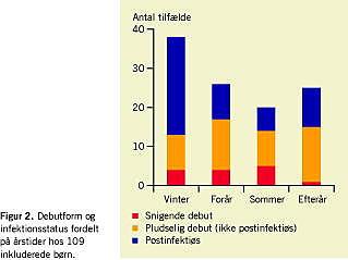 Femoghalvfems børn havde pludselig symptomopståen og/eller postinfektiøs ITP (Tabel 1). Halvdelen af de postinfektiøse tilfælde indtraf i vintermånederne december-februar (Figur 2 ). Uspecificeret øvre luftvejsinfektion var hyppigst (36%), variceller forekom hos otte børn (16%) forud for ITP. De noninfektiøse tilfælde var nogenlunde jævnt fordelt over årstiderne.