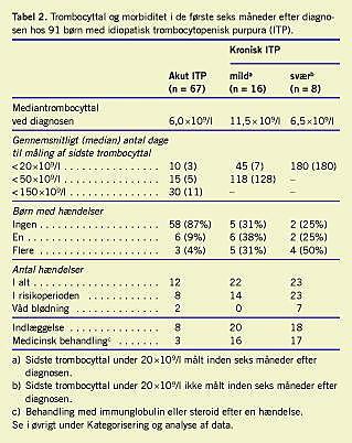 Konklusion: Børn med nydiagnosticeret ITP har stor sandsynlighed for hurtig remission og lav risiko for svær blødning. En lille gruppe børn med vedvarende svær trombocytopeni oplever betydende morbiditet.
