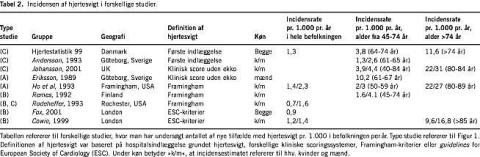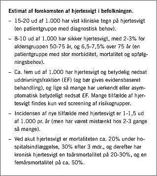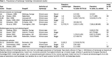 I befolkningsstudier og almen praksis har knap 2% af befolkningen haft kliniske tegn på hjertesvigt, hvilket spænder fra ca. 1% af de 50-årige til mere end 10% af de 70+-årige. Hvis man ekkokardiograferer patienter med formodet hjertesvigt, opfylder halvdelen ikke noget kriterium for hjertedysfunktion, og omkring 20-30% vil have nedsat EF [2, 3]. I Framingham Heart Study [4] anvendtes et strengere klinisk kriterium, og formentlig derfor steg andelen med systolisk dysfunktion til 49% (Tabel 1).