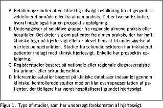 Det har været problematisk at sammenligne studierne af hjertesvigt, fordi der ikke findes nogen guldstandard for definitionen af hjertesvigt, hvilket har medført, at man i studierne anvendte forskellige kriterier for hjertesvigt, brug af ekkokardiografi og patientselektion. I Figur 1 grupperes studierne efter forskellige typer design.