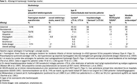 I hospitalspopulationer er iskæmisk hjertesygdom årsag hos mere end to tredjedele af hjertesvigtspatienterne (Tabel 3 ), mens en noget lavere andel angives for uselekterede, ældre og kvindelige patienter [9]. Forskelle i diagnostisk indsats kunne forklare dette, og i et studie fra London (Tabel 3 ] kunne en rutinemæssig koronararterografi af alle hjertesvigtspatienter under 75 år klassificere to tredjedele af 29% med en ukendt ætiologi som iskæmisk hjertesygdom [9].