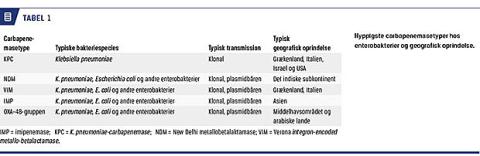tamase (NDM), Verona integron-encoded metallo-betalactamase (VIM) og imipenemase (IMP). Disse carbapenemaser har en karakteristisk geografisk oprindelse, hvor KPC især forekommer i Grækenland, Italien, Israel og USA, mens OXA-48 især ses i Middelhavsområdet og de arabiske lande, VIM påvises fortrinsvist i Italien og Grækenland, IMP forekommer overvejende i Asien, og NDM har en meget høj prævalens på det indiske subkontinent (Tabel 1).