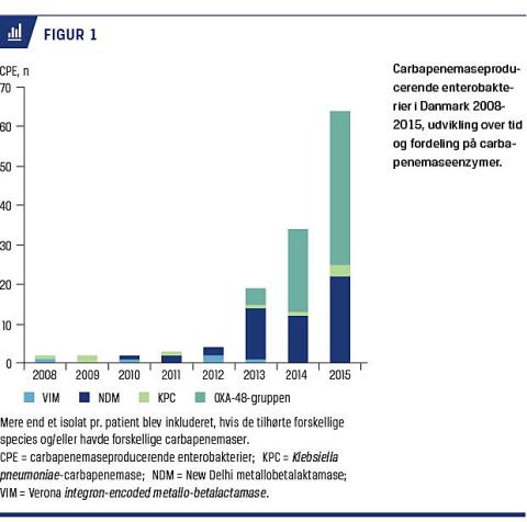 biotika og udgør et af de sidste værn mod multiresistente gramnegative bakterier. I det seneste årti har carbapenemresistens hos enterobakterier, som Escherichia coli og Klebsiella pneumoniae, spredt sig over hele verden med foruroligende hast [1]. I Danmark har forekomsten af carbapenemresistens hidtil været lav, men i de seneste år er der set en epidemisk stigning.
