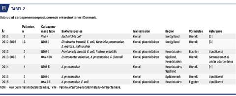 I alt 25 patienter er smittet ved syv sygehusrelaterede udbrud (Tabel 2). Det største udbrud er set i Region Nordjylland, hvor en NDM-1-producerende Citrobacter freundii er påvist hos 13 patienter med spredning af plasmidet til flere andre enterobakterier. Udbruddet startede i 2012 og pågik stadig i 2016 (Tabel 2) [3]. På Sjælland sås et udbrud med en variant af OXA-48-enzymet, OXA-436, hvor OXA-436-positive Enterobacter asburiae blev påvist hos tre patienter. Derudover har der været spredning af plasmidet til