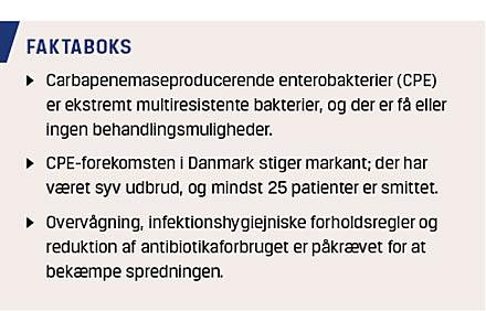 Gennem de seneste år har vi i Danmark oplevet en epidemisk stigning i forekomsten af CPE. Hvis udviklingen skal bremses, er det nødvendigt at udforme en systematisk og koordineret national strategi. Hvis der ikke sættes ind nu, risikerer vi, at CPE bliver endemisk forekommende i Danmark, som det er sket i adskillige europæiske lande. Obligatorisk overvågning af CPE, implementering af nationale infektionshygiejniske retningslinjer og en samlet national indsats for at nedbringe det stigende antibiotikaforbrug er tvingende nødvendigt for at bekæmpe spredningen af disse ekstremt multiresistente bakterier i Danmark.