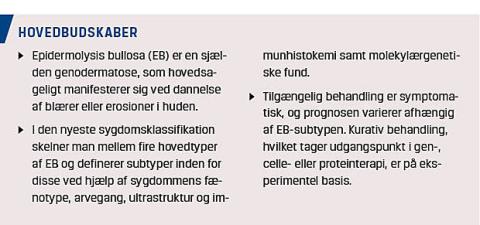 Arvelig epidermolysis bullosa (EB) er en genodermatose, der omfatter mere end 30 forskellige subtyper [1]. Fælles for disse er mekanisk svaghed af epitel eller endotel, hvorved der dannes blærer eller erosioner som følge af mindre, mekaniske belastninger.