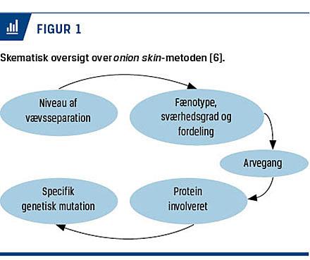 Tidligere har klassifikationen af EB været baseret på elektronmikroskopiske fund i hudbiopsier [5, 6]. Efterfølgende har sygdommens fænotype, arvegang, ultrastruktur og immunhistokemi samt molekylærgenetiske fund medvirket til at definere forskellige subtyper af EB; dette er publiceret af Fine et al i 2014 [6]. Der er identificeret flere nye kandidatgener og kliniske manifestationer af allerede beskrevne subtyper, hvilket er med til at danne baggrund for denne nye sygdomsklassifikation, som også betegnes onion skin-metoden (Figur 1). Ligesom når man skræller et løg, starter man i første niveau af klassifikationen med at skelne mellem fire hovedtyper af EB, ud fra hvor i huden vævsseparationen finder sted. Separationen er ved EBS intraepidermal, ved junktional epidermolysis bullosa (JEB) i lamina lucida af basalmembranzonen (BMZ) og ved dystrofisk epidermolysis bullosa i lamina densa af BMZ. Endvidere findes der en fjerde subtype med blandet vævsseparation, såkaldt Kindlersyndrom. I næste niveau af klassifikationen er fænotypen central, idet der skelnes mellem lokaliseret versus generaliseret affektion og forekomst af eventuelle diagnostiske markører. Generaliseret sygdom kan nuanceres ved at bruge begreberne »intermediær« og »svær«. De næste trin omhandler arvegang (recessiv/dominant), involveret protein og endelig specifik genetisk mutation (Tabel 1). Hvis man f.eks. har mistanke om generaliseret svær recessiv DEB, kan man som kliniker vælge at springe direkte til mutationsanalyse (løgets kerne), hvilket kan være både økonomisk og tidsbesparende. Ved den nye klassifikation benyttes der overvejende deskriptive termer i stedet for som tidligere eponymer. De eneste undtagelser er EBS-Ogna og Kindlersyndrom.