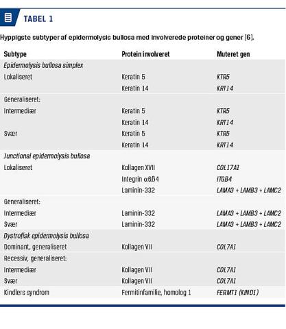 koder for keratin 5 eller 14 [21]. De forskellige mutationer fører til delvis eller fuldstændig defekt i tværbindingen af keratinfilamenter i de basale keratinocytter. Den strukturelle svaghed resulterer i dannelse af intraepidermale blærer. Ved JEB er arvegangen autosomal recessiv [6]. Hos mange patienter med den alvorligste subtype af JEB findes der hotspotmutationer [1]. Mutationerne fører til defekt i laminin-332 og/eller kollagen type XVII, der giver anledning til vævsseparation i lamina lucida af BMZ [11]. Fælles for alle DEB-subtyper er mutation af COL7A1, og der findes talrige familiespecifikke mutationer [22]. Genet koder for kollagen type VII, der fungerer som forankringsfilament mellem BMZ og dermis. Ved DEB fører dysfunktionen til blæredannelse i øverste del af dermis. Der findes DEB med autosomal recessiv og DEB med autosomal dominant arvegang.