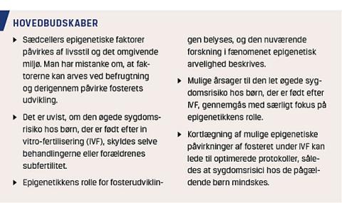 Flere ting tyder på, at en ændret epigenetik som resultat af håndteringen og manipuleringen af embryonet ved assisteret reproduktion er nøglen til at forstå den ændrede sygdomsrisiko hos børn, der er født efter ART. Hos mus er det påvist, at hormonstimulation påvirker fosterets epigenetik, og det er observeret, at IVF påvirker de epigenetiske faktorer i placenta hos mus under graviditeten [27, 28]. Ved kultivering af museembryoner kan selve indholdet af dyrkningsmediet ændre ekspressionen af de imprintede gener i blastocyststadiet og påvirke ungernes udvikling og adfærd senere hen [29]. Det er dog stadig uvist, om de epigenetiske faktorer, der induceres som respons til interventionerne under de enkelte ART-metoder, er årsag til de rapporterede ændringer i sygdomsrisiko, der ses hos børn, som er født efter ART. I et samarbejde mellem Metabolismecenteret (NNFCBMR, Københavns Universitet), Gynækologisk/Obstetrisk Afdeling (Hvidovre Hospital), og Fertilitetsklinikken (Rigshospitalet) er man netop ved at undersøge, om epigenetikken kan forklare det ændrede perinatale resultat og den let øgede sygdomsrisiko, der ses senere hen. Er dette tilfældet, er der stor mulighed for, at vi på længere sigt kan udvikle metoder, der påvirker den ændrede epigenetik, og derigennem nedsætte den let øgede risiko for sygdom hos de ca. 5.000 børn, der årligt fødes efter assisteret reproduktion.