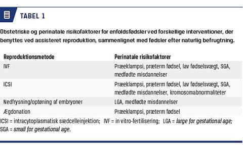 15-20% af alle par oplever problemer med infertilitet, og ca. 5.000 børn – omkring 6% af en årgang – bliver årligt født i Danmark efter brug af ART [14, 15]. Børn, der er født efter ART, har en smule større risiko for at få sygdom senere hen end børn, der er født efter naturlig befrugtning. I de senere år har der været særligt fokus på metaboliskassocierede lidelser såsom kardiovaskulære sygdomme samt ændret lipid- og glukosemetabolisme, som man i en række mindre studer har fundet øget forekomst af hos individer, der er undfanget ved ART [16-19], også når der korrigeres for eventuel underliggende subfertilitet hos forældrene [20]. Derudover ses der en øget risiko for præterm fødsel og en øget forekomst af perinatale komplikationer [21]. De forskellige in vitro-fertiliseringsmetoder er endvidere forbundet med ændret fødselsvægt hos børnene. Således giver oplægning af friske, befrugtede æg i den hormonstimulerede cyklus en gennemsnitlig lavere fødselsvægt hos børnene end hos børn, der er født efter naturlig befrugtning, mens oplægning af nedfrosne/optøede æg giver højere risiko for fødsel af fostre som er large for gestational age (LGA) [22] (Tabel 1). Det kan ikke udelukkes, at en del af den øgede risiko for sygdom kan skyldes forældrenes egne reproduktive sygdomme. I flere lignende studier har man ikke justeret for denne mulige konfounder, hvilket det er vigtigt at være opmærksom på ved gennemgang af litteraturen, og ved fremtidige undersøgelser [23, 24]. Flere epidemiologiske studier og adskillige dyreforsøg tyder dog på, at selve de interventioner, der benyttes ved de forskellige former for ART, også udgør en del af de tilgrundliggende årsager til børnenes ændrede sygdomsrisiko. Der er således forskel på barnets risikoprofil, alt efter om det befrugtede æg (embryonet) opsættes friskt eller efter nedfrysning/optøning, og om der udføres in vitro-fertilisering (IVF), intracytoplasmatisk sædcelleinjektion eller intrauterin insemination [22, 23, 25, 26]. Selve hormonstimuleringen af kvinden mistænkes også for at kunne påvirke barnets risikoprofil [27], men der er endnu ikke fundet egentlige årsagsmekanismer for, hvordan de forskellige metoder, der benyttes ved assisteret reproduktion, kan påvirke fosterets udvikling og derigennem barnets risiko for sygdom senere hen.