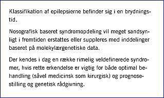Med denne og en række senere erkendte epileptiske syndromer er epilepsiklassifikationen blevet tilføjet en molekylærgenetisk dimension, der meget vel kan bidrage til at revolutionere vor opfattelse af epilepsierne i fremtiden [7].
