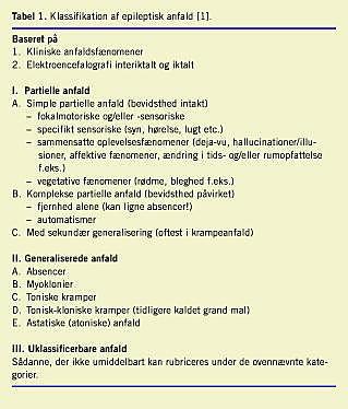 I 1981 vedtog The International League Against Epilepsy (ILAE) en klassifikation af epileptiske anfald [1] (Tabel 1 ), og otte år senere blev der vedtaget en tilsvarende klassifikation af epileptiske syndromer [2]. For første gang fik man et forpligtende koncept for beskrivelse og kategorisering af epilepsierne, hvilket har været et stort fremskridt for kommunikationen mellem epileptologer globalt. Med det stigende kendskab til epilepsiernes meget varierende ætiologi, symptomer, elektroencefalogram (eeg)-patologi samt forløb og prognose havde det i mange år stået klart, at det er meningsløst at omtale epilepsi i entalsform.