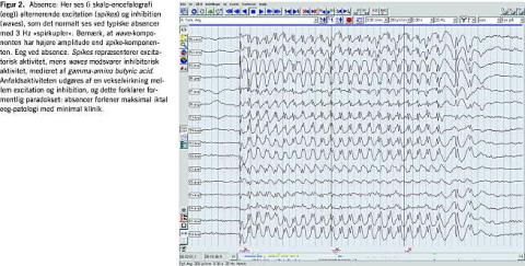 Absencer: »excitations-inhibitions-kobling«, hvor impulsudsendelsen alternerer med massiv regional inhibition, formidlet via gamma-amino butyric acid (GABA)-aktivitet (Figur 2 ). Denne mekanisme, der altså er meget forskellig fra den foregående, ses typisk ved absencer. Dette forklarer, at denne anfaldstype som regel ikke reagerer på en del af de antiepileptika, der generelt ellers er særdeles effektive (f.eks. carbamazepin/oxcarbazepin), og at stoffer, der forstærker GABA-aktiviteten i nervesystemet (vigabatrin og tiagabin), oftest vil medføre en forværring af anfaldene. Hermed understreges betydningen af at klassificere anfaldene så præcist som muligt. Ved absencer er interiktalt og iktalt eeg kvalitativt identiske.