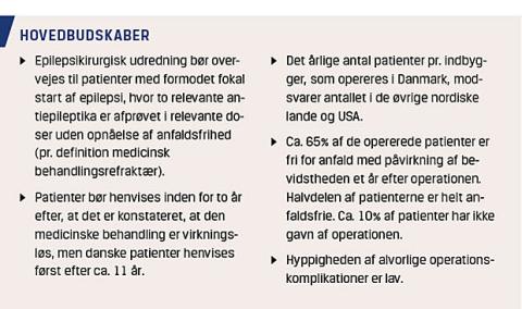 resultaterne på internationale centre, og ligeså modsvarer antallet af opererede patienter i Danmark (6,2 operationer/år/mio. indbyggere) tallene i sammenlignelige lande, nemlig 4,7 i USA [20], 5,7 i Norge, 5,2 i Sverige og 8,1 i Finland. Der er ingen væsentlig forskel i antallet af opererede patienter i de forskellige landsdele i Danmark [22]. Status for epilepsikirurgi i Danmark er et resultat af mange års tæt klinisk og forskningsmæssigt samarbejde på tværs af landsdelene og det forhold, at kirurgien er samlet på ét sted i landet.