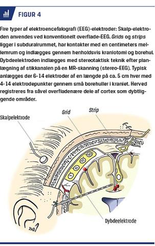 I Danmark benyttes der såvel 256-kanalers-EEG (Rigshospitalet og Epilepsihospitalet i Dianalund) (Figur 3) og MEG (Aarhus Universitetshospital) til at lokalisere kortikale områder, som genererer epileptiform aktivitet. Metoderne er værdifulde ved planlægning af intrakranial EEG [13, 14]. Præliminære danske resultater bekræfter, at man med de to metoder helt overvejende genererer identiske resultater.