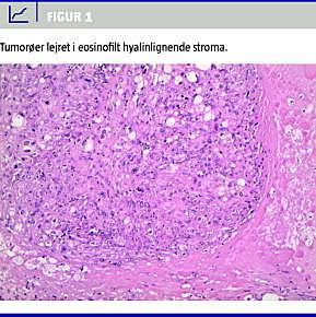 På blodig baggrund fandtes talrige vævsflager, der bestod af et eosinofilt hyalinlignende stroma med infiltration af tumorceller, der var lejret i strenge og små reder (Figur 1 ). Tumorcellerne var relativt ensartede med dårligt defineret cytoplasma og store nukleoleholdige kerner. Der var ingen uddifferentiering af tumor. Der fandtes en proliferationsrate på 10%.