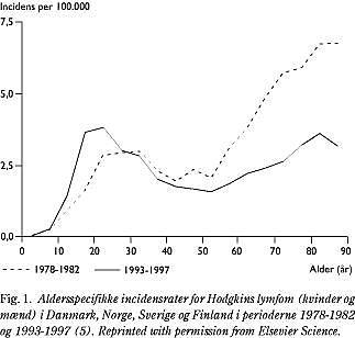 Histologisk er HL kendetegnet ved et beskedent antal HRS-celler, der er karakteristiske store, binukleære celler. HRS-celler kan være svære at påvise på grund af ledsagende inflammatoriske forandringer og varierende grader af fibrose, og diagnosen kan derfor være svær at stille (3). På baggrund af bl.a. histopatologiske og kliniske forskelle opdeles HL i dag i to hovedgrupper, der bliver betegnet henholdsvis nodular lymphocyte predominant HL, der udgør ca. 5% af alle HL, og klassisk HL. Sidstnævnte gruppe inddeles videre i fire histologiske varianter (a) nodular sclerosis (70% af HL), (b) mixed cellularity (20-25% af HL) og (c) lymphocyte rich og (d) lymphocyte depleted (tilsammen knap 5% af HL) (3). Der diagnosticeres årligt ca. 120 tilfælde af HL i Danmark; færre hos kvinder end hos mænd, svarende til aldersjusterede incidensrater på 1,7 og 2,6 per 100.000 hos kvinder og mænd i 1998 (4). I de seneste årtier har forekomsten af HL, særligt nodular sclerosis -HL, været stigende i aldersgruppen 15-29 år flere steder i verden, mens sygdommen er blevet mindre hyppig i aldersgruppen over 50 år (5, 6) (Fig. 1 ).