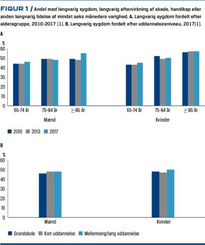 Et af de mål, der stagnerede i perioden 2010-2017, var langvarig sygdom, der blev målt som et ja-/nej-spørgsmål. Denne indikator har medvirket til konklusionen om en stagnation i ældres sundhedstilstand. Figur 1 viser andelen med langvarig sygdom fordelt på aldersinterval og uddannelsesniveau.