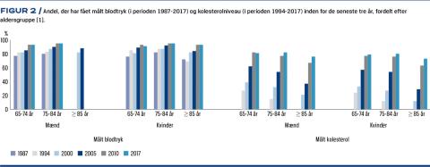 Ældre får i højere grad end tidligere behandling [23] og bliver i højere grad helbredsundersøgt. Figur 2 stammer fra Ældreprofilen 2019 og viser andelen, der har fået målt hhv. blodtryk og kolesterolniveau inden for de seneste tre år. En øgning eller stagnation i selvrapporterede sygdomme kan derfor afspejle en øget diagnostisk aktivitet.
