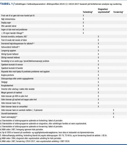 Størstedelen af helbredsparametrene viste en stagnation eller en usystematisk udvikling, hvor nogle aldersgrupper oplevede en fremgang og andre en forværring. Det var f.eks. tilfældet for andelen af ældre med langvarig sygdom og andelen med dårligt fysisk helbred. Samtidig var andelen, som havde et usundt kostmønster og var svært overvægtige, steget. Tabel 1 giver et overblik over de sundheds- og trivselsmål, der er inkluderet i Ældreprofilen 2019, og viser, om der er sket en forbedring, en stagnation eller en forværring for den pågældende indikator baseret på analyse og vurdering fra denne artikels forfattere.