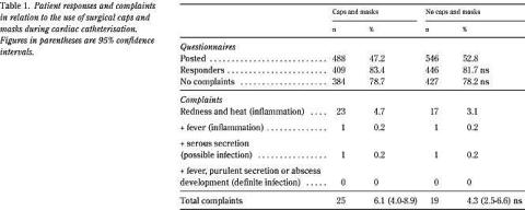 Summary No effect of surgical caps and masks during cardiac catheterisation? Ugeskr Læger 2002; 164: 1673-5. Introduction: Despite the lack of scientific evidence, surgical caps and masks are worn routinely by many physicians and nurses in the catheterisation laboratories to avoid local and generalised infections. When we changed our practice, we performed a randomised study to assure the quality of our routine. Material and methods: All patients undergoing left- or right-sided cardiac catheterisation were randomly allocated to our five laboratories. About two months after the procedure, the patients were sent a questionnaire concerning signs and symptoms of possible inflammation or infection after the procedure. Results: Of 1,034 patients, 855 (82.7%) responded to the questionnaire. Although 25 patients in the caps and mask group vs 19 patients in the other group (6.1% vs 4.3%, ns) had complaints from the procedural access site in the groin, none of these could be ascribed to definite infection. Discussion: The use of caps and masks during percutaneous cardiac catheterisation procedures is based on the concept that the infection rate of patients is reduced. The size of the catheter used, procedure time, and the use of caps and masks by both the surgeon and the assisting staff are discussed. Conclusion: The routine use of caps and masks does not seem to have that much beneficial impact on the occurrence of procedure-related inflammations or infections in the cardiac catheterisation laboratory.