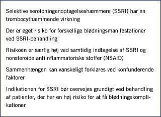 Summary Is the use of selective serotonin reuptake inhibitors associated with an increased risk of bleeding? Ugeskr Læger 2006;168(23):2232-2236 Recent studies have shown that there may be an increased risk of upper gastrointestinal tract bleeding when patients use selective serotonine reuptake inhibitors (SSRIs). We have reviewed the available epidemiological papers on this subject. There is apparently an increased risk of clinically significant bleeding episodes in patients treated with SSRIs. Two papers report a multiplicative interaction for combined treatment with non-steroidal anti-inflammatory drugs (NSAIDs) and SSRIs. We conclude that SSRIs should be used with caution in patients with an increased risk of bleeding.