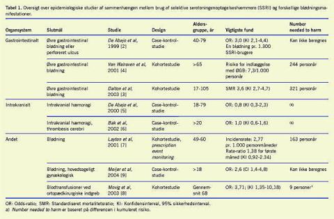 I et større dansk kohortestudie, der er foretaget af Dalton et al [3] og baseret på det nordjyske receptregister The Pharmacoepidemiologic Prescripton Database of North Jutland (PDNJ) [15], er der påvist lignende resultater som dem, der blev fundet af de Abajo et al. I dette studie opgjorde man indlæggelserne for ØGB-patienter i en kohorte på 26.005 antidepressivabrugere. Studiet er analyseret ved standardiseret mortalitetsratio (SMR)-teknik, hvor baggrundspopulationen uden brug af antidepressiva og andre disponerende faktorer for ØGB er brugt som reference. Dalton et al fandt en SMR for ØGB på 3,6 (KI = 2,7-4,7) hos brugere af SSRI, ingen sammenhæng mellem brugen af andre typer af antidepressiva og blødning og ingen øget blødningsrisiko forbundet med tidligere brug af SSRI. Kombinationen af NSAID og SSRI var forbundet med en stærkt øget blødningsrisiko (SMR = 12,2, KI = 7,1-19,5).