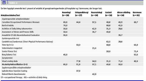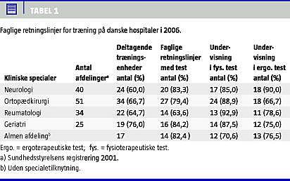 Resultater: I alt 47 hospitaler og 227 kommuner deltog, hvilket svarer til samlede svarprocenter på henholdsvis 69% og 84%. I alt 116 træningsenheder blev identificeret på hospitalerne, heraf 24 neurologiske, 34 ortopædkirurgiske, 22 reumatologiske, 19 geriatriske og 17 »almene". Udbredelsen af faglige retningslinjer og brugen af test var størst for geriatri (84%) og neurologi (83%). Kombinationen af anvendte test var stort set den samme i kommunerne og inden for geriatrien. De påviste forskelle mellem de kliniske specialer med hensyn til standardisering afspejler forskelle mellem de sygdomsformer, der behandles.