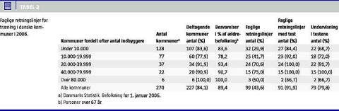 Samlet set havde knapt 45% af danske kommuner nedskrevne, tilgængelige faglige retningslinjer. Forskellen mellem små, middelstore og store kommuner var imidlertid markant. Således angav (jf. Tabel 2) mere end 70% af kommunerne med et befolkningstal på 20.000-79.000 at have faglige retningslinjer mod kun 30% af de små kommuner (under 10.000 indbyggere). Alle middelstore og store kommuner, som havde faglige retningslinjer, anvendte standardiserede test.