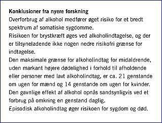 Selv et lavt alkoholindtag kan øge risikoen for alkoholafhængighed og somatisk sygdom såsom leversygdom [5], kræft i mundhule, strube, spiserør, lever [6, 7], tyk- og endetarm [6, 8] samt bryst [9] for nogle, mens moderat alkoholindtagelse kan sænke risikoen hjerte-kar-sygdom [1, 7] og muligvis ikkeinsulinkrævende diabetes blandt undergrupper af befolkningen. Kvinder har en signifikant øget risiko for at få skrumpelever ved et lavere forbrug end mænd [1]. Der er en dosis-respons-sammenhæng mellem alkoholindtag og risiko for senere afhængighed, men risikoen for afhængighed er betydelig selv ved to genstande pr. dag.