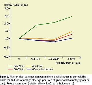 Antallet af undersøgelser af sammenhængen mellem alkoholindtag og dødelighed blandt unge voksne er relativt beskedent. Figur 1 viser resultaterne fra en af de største undersøgelser, Nurses Health Study, og de peger på en eventuel aldersafhængig effekt af alkoholindtag. Risikoestimaterne tyder på, at der er en forskellig effekt af alkoholindtag i forskellige aldersgrupper, og at alkoholindtag altså ikke er gavnligt for kvinder under 40 år. Der er fundet samme forhold for mænd.