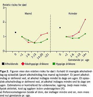 Episodisk alkoholindtag refererer til indtag af fem eller flere genstande inden for et kortere tidsinterval (typisk en aften). I det seneste årti er der foretaget en række undersøgelser af betydningen af episodisk alkoholindtag for sygelighed og dødelighed. Resultaterne af disse undersøgelser tyder på, at et episodisk indtag øger dødsrisikoen og risikoen for hjerte-kar-sygdomme. Samme tendens ses i forhold til følgende dødsårsager: iskæmisk hjertesygdom, ikkefysiske årsager (f.eks. vold og ulykker) og alkoholrelaterede sygdomme. En dansk undersøgelse viser, at et episodisk alkoholindtag øger risikoen for død sammenlignet med et alkoholindtag, der fordeles jævnt i løbet af ugen [4] (Figur 2 ).