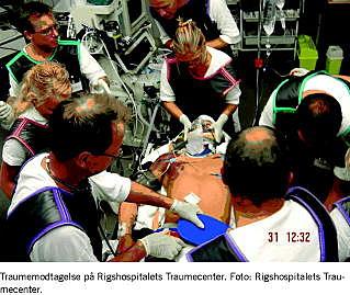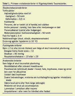 Der blev foretaget en retrospektiv gennemgang af alle patienter, der primært blev visiteret til Rigshospitalets traumecenter efter et traume i en etårig periode fra den 1. januar til den 31. december 2004 (Tabel 1 ). Patienterne blev i TC modtaget af et traumeteam på 15 personer bestående af en speciallæge i anæstesiologi (teamleder), en speciallæge i ortopædkirurgi, en anæstesiolog og en ortopædkirurg i uddannelsesstilling, en anæstesisygeplejerske, tre traumesygeplejersker, to traumeportører, en sekretær, to radiografer og to laboranter. Ved behov tilkaldtes speciallæger i radiologi, neurokirurgi, thoraxkirurgi, abdominalkirurgi, øre-næse-hals-kirurgi, tand-mund-kæbe-kirurgi, karkirurgi, urologi, pædiatri og plastikkirurgi. Med udgangspunkt i ABCDE-principperne undergik patienterne en systematisk undersøgelses- og behandlingsstrategi. Computertomografi (CT) blev udført på liberal indikation, hvori indgik såvel traumemekanisme som mistanke om læsioner. Såfremt der ikke blev fundet behandlingskrævende skader eller kun mindre skader, blev patienterne efterfølgende observeret et variabelt antal timer i traumecentret. Formålet med denne observationsperiode var at have mulighed for at afsløre sene manifestationer af behandlingskrævende skader, at sikre en sufficient smertebehandling og at drage omsorg for psykiske og sociale forhold, som følge af traumet.