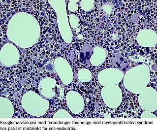 Efterfølgende steg trombocyttallet til 771 × 109 /l. Hæmoglobin, leukocyttal og C-reaktivt protein (CRP) var fortsat normale. En knoglemarvsbiopsi viste hyperplastisk knoglemarv med et øget antal megakaryocytter af varierende størrelse, livlig myelopoiese, men normal erytropoiese foreneligt med myeloproliferativt syndrom. Erytrocyt- og plasmavolumenbestemmelse var normale. Ved ultralydskanning af abdomen fandtes normal lever- og miltstørrelse.