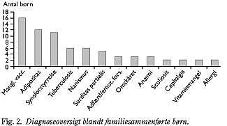 Resultater: I skoleåret 1999/2000 blev der undersøgt 148 familiesammenførte børn. Børnene var i alderen mellem 5,1 og 18,0 år. Børnene kom fra 25 forskellige lande med en prævalens af børn fra Somalia på 29,3%. I alt 55 børn dvs. 37,4% boede med kun en af de biologiske forældre, 18,5% af børnene havde tidligere haft en eller flere sygdomme. De fleste børn (91,2%) blev ved undersøgelsen vurderet til at have en god almentilstand og en alderssvarende sansemotorisk udvikling. Blandt de 148 undersøgte børn har 48,3% fået en eller flere diagnoser.