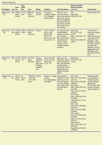 Af ni kohorteundersøgelser med CVD som effektmål har man i fem undersøgelser beregnet risikoen for et samlet indtag af grøntsager og frugt [6-10], mens seks undersøgelser desuden eller kun har medtaget separate risikoberegninger for indtaget af grøntsager og frugt [8, 9, 11-14]. I alle studierne påvises en risikoreduktion i gruppen med højt indtag af grøntsager og/eller frugt sammenlignet med gruppen med lavt indtag, som i flere tilfælde er signifikant.