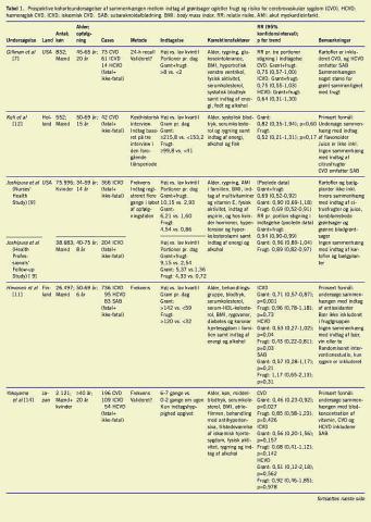 I tre studier oplyses kun om sammenhængen med ICVD [8-10], mens fire studier også oplyser data for sammenhæng med hæmoragisk cerebrovaskulær sygdom (HCVD) [7, 11, 13, 14]. Den inverse sammenhæng mellem indtaget af grøntsager og frugt og risiko synes at være til stede både for iskæmi og for hæmoragi. Kun i en undersøgelse oplyser man data for sammenhængen med subaraknoidalblødning [11] - i de øvrige undersøgelser er subaraknoidalblødning inkluderet i total CVD.